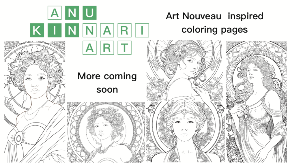 Unleash your creativity with our downloadable Art Nouveau coloring pages, featuring five intricate illustrations for relaxation and self-expression.